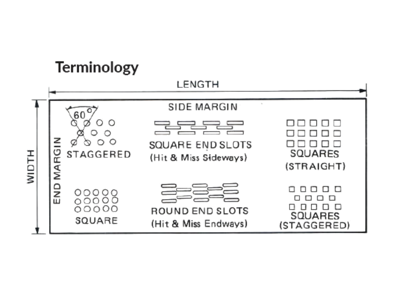 - Size, Shape & Configuration of perforations. Additional hole size, pitch and configuration may be available on request. if you required perforations to your own specifications, please submit full details and drawing (if available).